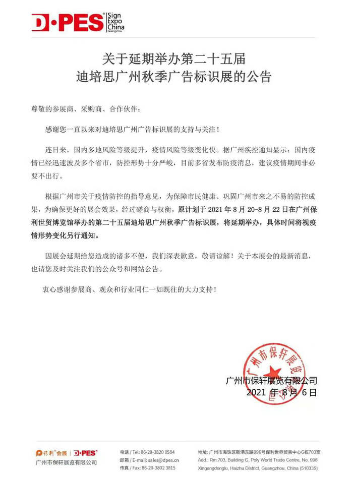 根据广州市关于疫情防控的指导意见,为保障市民健康、巩固广州市来之不易的防控成果,为确保更好的展会效果,主办方决定原计划于2021年8月20-8月22日在广州保利世贸博览馆举办的第二十五届迪培思广州秋季广告标识展,将延期举办,具体时间将视疫情形势变化另行通知。